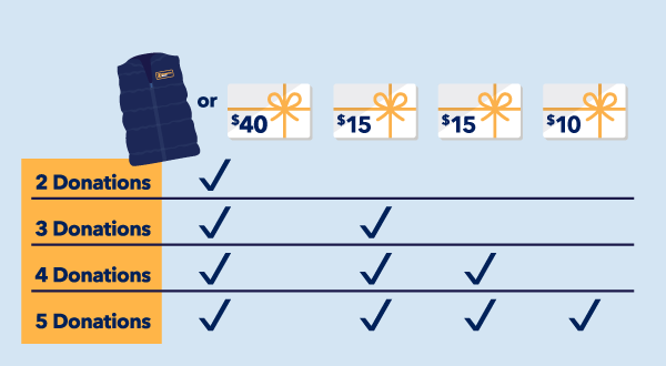 - If a donor selects the premium puffer vest, the maximum amount of eGift cards they can receive is $40.