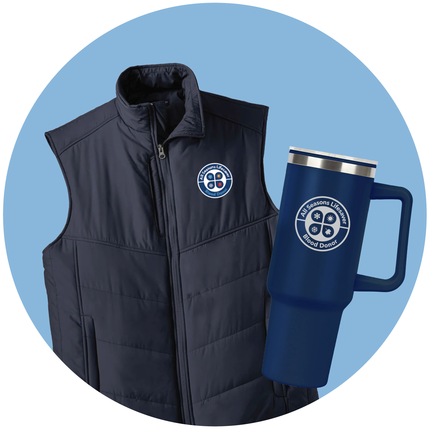 - Donors who register and present to donate at least once per season can select the 40oz travel tumbler in lieu of the premium puffer vest.