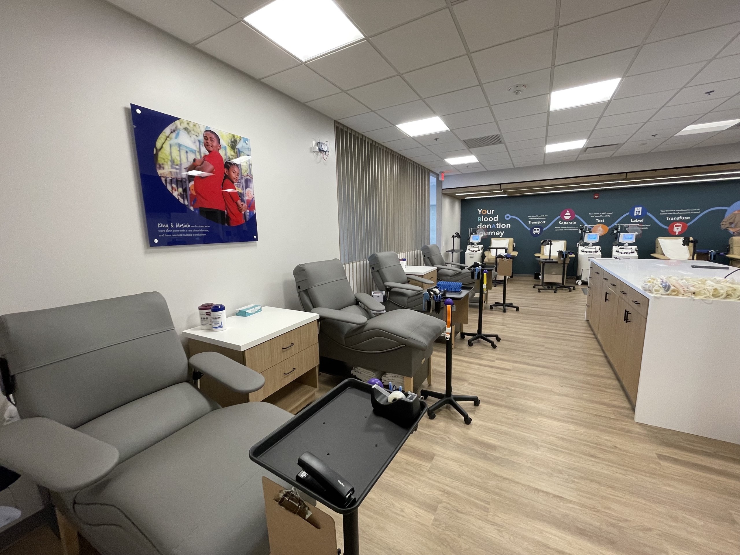 The Lee’s Summit donor center, located at 1551 NE Douglas Street, is CBC’s eighth fixed site. It features a spacious, modern look with 11 donor beds, an enhanced canteen experience, accessible phone chargers, and patient stories featured throughout the building.